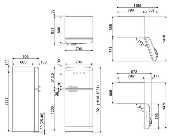 - Głębokość przy otwartych drzwiach pod kątem 90° 1470