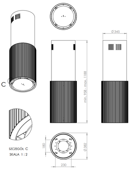 - wys. × szer. × głęb.: 958 – 1190 × 382 × 382 mm