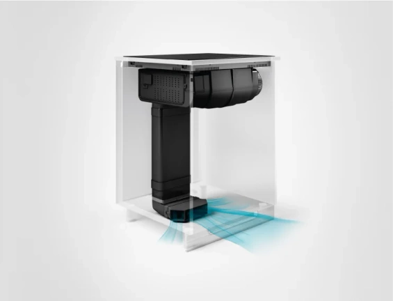 Z zastosowaniem tego zestawu urządzenie może być użytkowane jako pochłaniacz. Przefiltrowane powietrze jest doprowadzane pod szafkę. Niezbędny otwór wentylacyjny w cokole może być wykończony za pomocą będącego w komplecie profilu chromowanego.