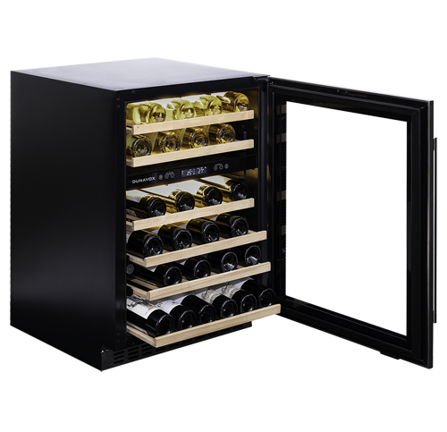 Dwustrefowy, model podblatowy mogący pomieścić 46 butelek wina. Wyróżnia się elegancką obudową i wyświetlaczem LCD. Model DUNAVOX Flow- 46D pasuje idealnie do nowoczesnej kuchni. Butelki są umieszczone na teleskopowych szynach i oświetlone białym, bursztynowym i niebieskim oświetleniem wewnętrznym LED. Temperatura w górnej strefie musi być niższa niż w dolnej. Należy zwrócić uwagę, że model ten jest przeznaczony do zabudowy podblatowej.