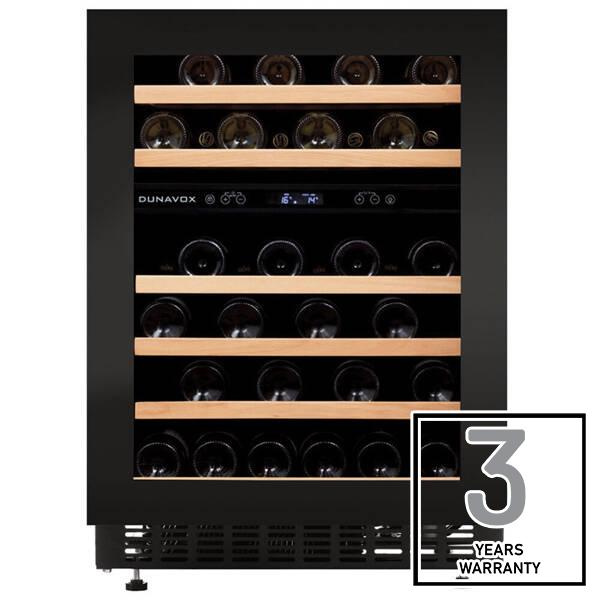 Model dwustrefowy, 46-butelkowy podblatowy ze zintegrowanym uchwytem w drzwiach.. Elegancki wygląd zewnętrzny i wyświetlacz LCD. DUNAVOX Flow-46H idealnie nadaje się do nowoczesnych kuchni. Butelki są podparte na teleskopowych szynach i otoczone białym, bursztynowym i niebieskim oświetleniem LED wewnątrz. Górna strefa musi być zimniejsza niż dolna. Należy pamiętać, że ten model jest przeznaczony do zabudowy podblatowej.
