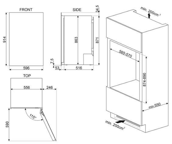 - Głębokość przy otwartych drzwiach pod kątem 90°: 1150 mm