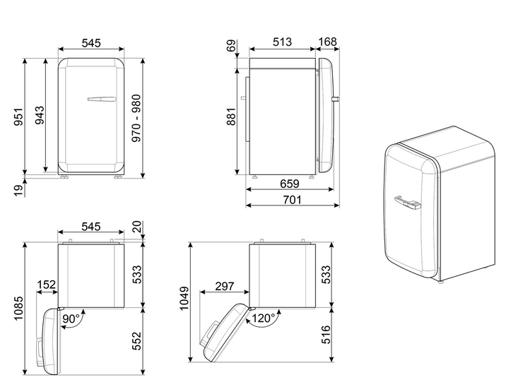 - Głębokość przy otwartych drzwiach pod kątem 90°: 1085 mm