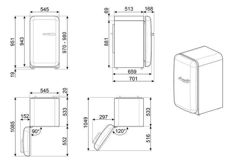 - Głębokość przy otwartych drzwiach pod kątem 90°: 1085 mm