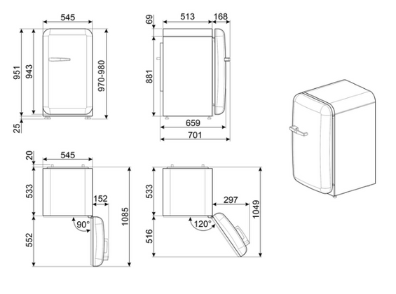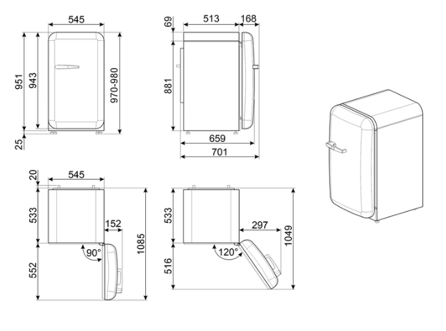 - Głębokość przy otwartych drzwiach pod kątem 90°: 1085 mm