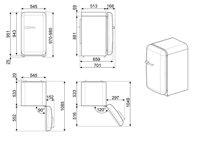 - Głębokość przy otwartych drzwiach pod kątem 90°: 1085 mm