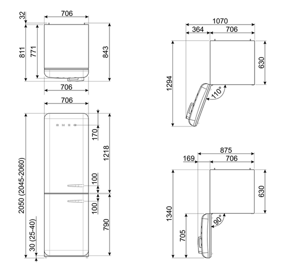 - Głębokość przy otwartych drzwiach pod kątem 90°: 1340 mm