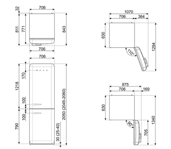 - Głębokość przy otwartych drzwiach pod kątem 90°: 1340 mm