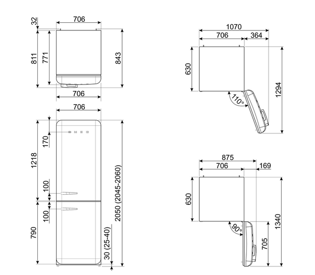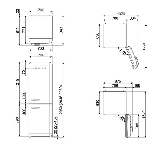 - Głębokość przy otwartych drzwiach pod kątem 90°: 1340 mm