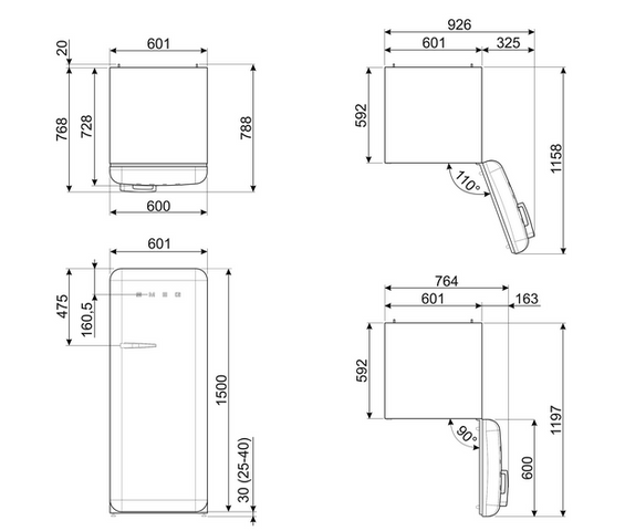 - Głębokość przy otwartych drzwiach pod kątem 90°: 1197 mm