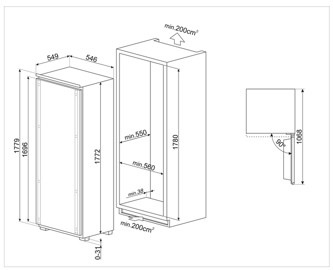 - Szerokość produktu z maksymalnie otwartymi drzwiami: 548 mm