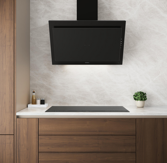 - Dekoracyjny pochylony okap kominowy o szerokości 90 cm
