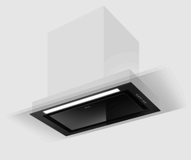 Dyskretny okap podszafkowy, dostępny w wykończeniach ze stali nierdzewnej, czarnego matu i stali nierdzewnej/białego szkła, z rozproszonym oświetleniem LED i sterowaniem dotykowym.