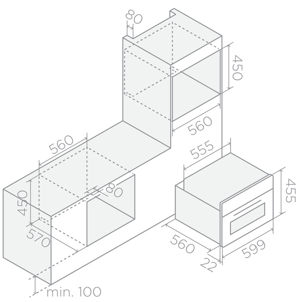 - Wymiary wnęki do instalacji piekarnika: 56x45x57 cm