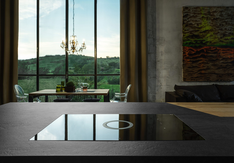 Indukcyjna płyta kuchenna z wbudowanym mechanizmem pochłaniania oparów. Aktywuje się tylko jednym gestem, filtruje i oczyszcza powietrze.