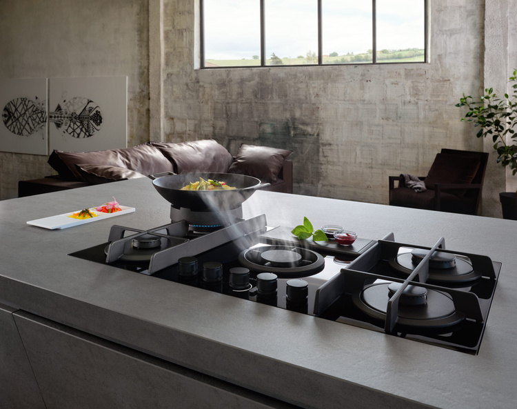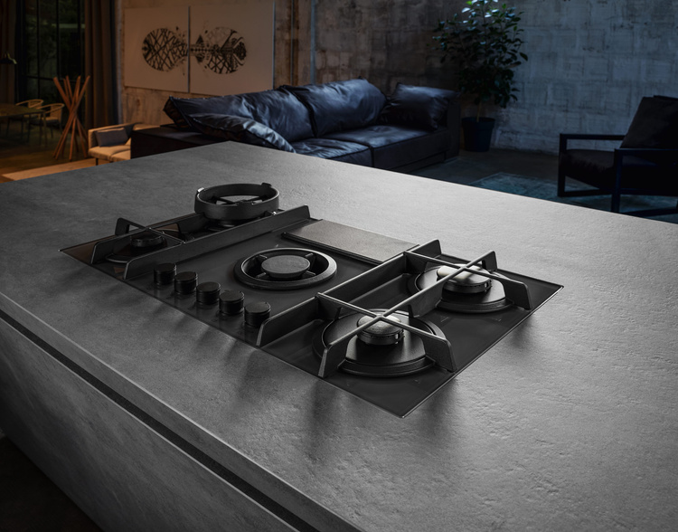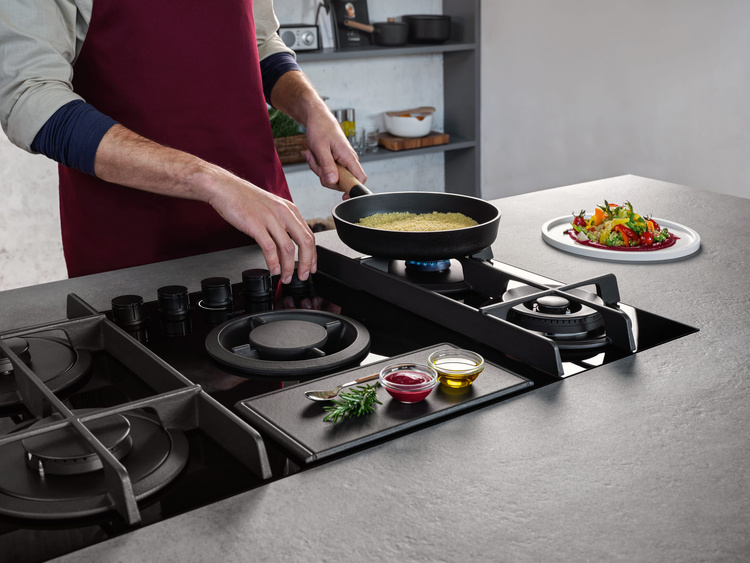 Magia płomienia, skuteczność nowatorskich technologii. W chwili debiutu, była to pierwsza na rynku płyta gazowa z wbudowanym okapem. Gwarantowane pełne bezpieczeństwo: to urządzenie spełnia wszystkie wymogi przepisów, dotyczących wydajności i mocy płomienia, nie rezygnując przy tym z doskonałej wydajności. Żeliwne elementy stanowią połączenie estetyki i funkcjonalności, a zamknięte i płaskie ruszty krzyżowe gwarantują stabilność naczyń i łatwość ich przesuwania na płycie kuchennej. Żeliwna pokrywa obszaru filtrów staje się oryginalną powierzchnią nośną. Opcjonalny stojak podtrzymujący patelnię Wok zwiększa możliwe warianty gotowania. Zintegrowany system pochłaniania oczyszcza powietrze z oparów i kuchennych zapachów - również automatycznie - dzięki obecności łączonego filtra przeciwtłuszczowego, przeciwzapachowego i absorbującego wilgoć, który gwarantuje maksymalną skuteczność i łatwość konserwacji.