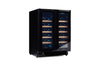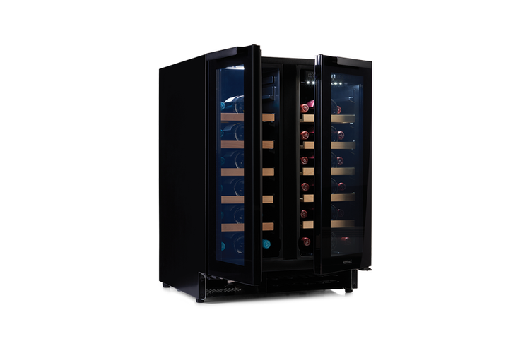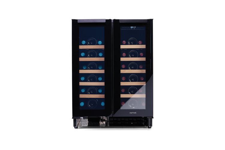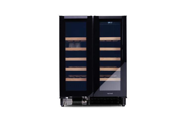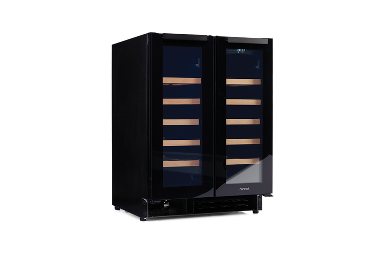 Dwustrefowa, dwudrzwiowa chłodziarka do wina Norcool do zabudowy pod blatem kuchennym.