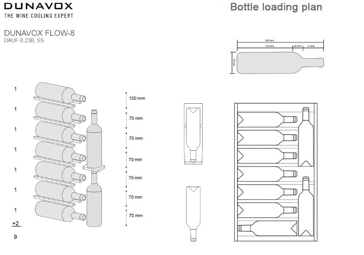 - Pojemność - ilość butelek (butelka Bordeaux 0,75 litra) 9 (7 na półkach, 2 na stojąco)