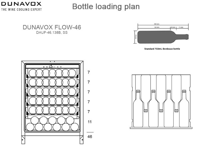 Model jednostrefowy, podblatowy mieszczący 46 butelek. To przeprojektowana wersja jednego z najpopularniejszych modeli podblatowych. Charakteryzuje się eleganckim wyglądem i uchwytem ze stali nierdzewnej. Model DUNAVOX Flow-46 pasuje idealnie do nowoczesnej kuchni. Butelki są umieszczone na solidnych drewnianych półkach oraz oświetlone białym, bursztynowym i niebieskim oświetleniem wewnętrznym LED. Należy zwrócić uwagę, że model ten jest przeznaczony do zabudowy podblatowej.