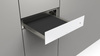 Szuflada nie ma bocznych ścianek, co umożliwia wygodne wyjmowanie talerzy i naczyń bez dotykania gorących elementów. Dzięki zachowaniu temperatury pokojowej front szuflady jest bezpieczny w dotyku, a otwieranie ułatwia system push/pull i całkowicie wysuwane prowadnice teleskopowe.