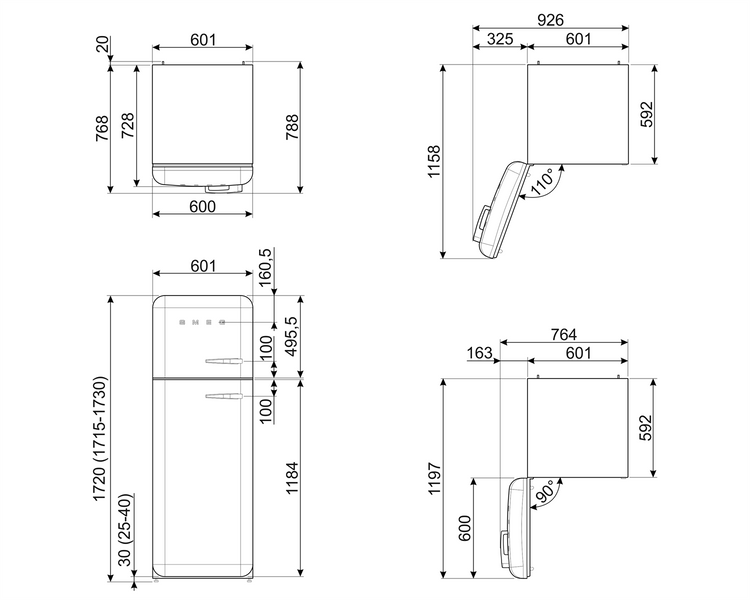 - Szerokość produktu z maksymalnie otwartymi drzwiami: 926 mm