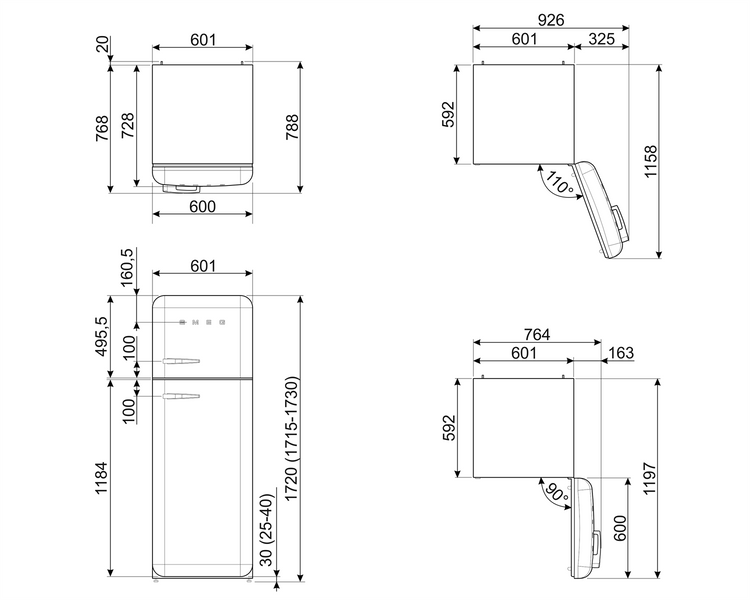 - Głębokość przy otwartych drzwiach pod kątem 90°: 1197 mm